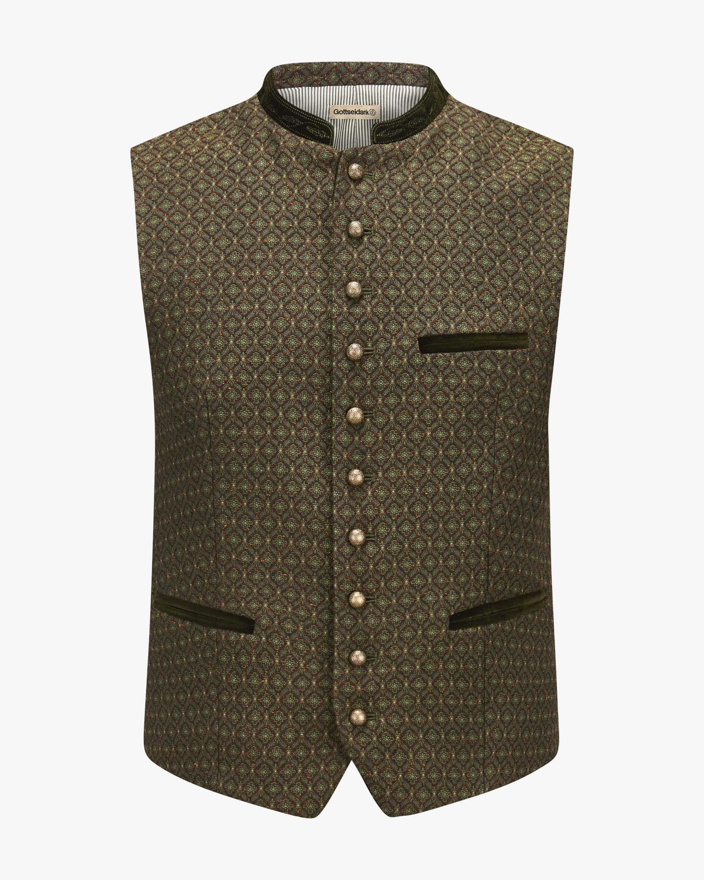 Trachtenweste Konstantin für Herren von Gottseidank in Grün, Cognac und Schwarz. Das taillierte Modell überzeugt mit dem einzigartigen, exklusiv bei LODENFREY erhältlichen Rauten-Design, welches ihrem Trachten-Look eine besondere Note verleiht. Zugleich runden raffinierte Knöpfe sowie klassische Details das traditionelle Gesamtbild stilvoll ab.
